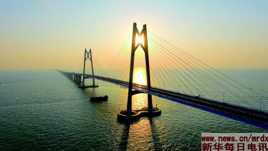 ▲晨光中的港珠澳大桥“中国结”桥塔(2017年12月27日摄)。