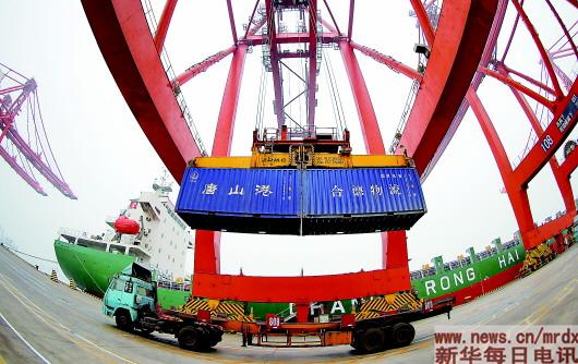 ▲2017年12月30日,工人在唐山港京唐港区集装箱码头操作机械设备往轮船上吊装集装箱。