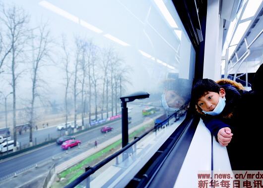 ▲2017年12月30日,一名小朋友坐在新开通的燕房线车厢内向外张望。