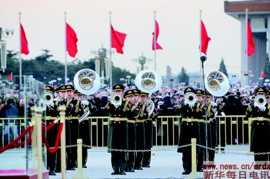 ▲1月1日,礼号手在北京天安门城楼吹响升旗号角。