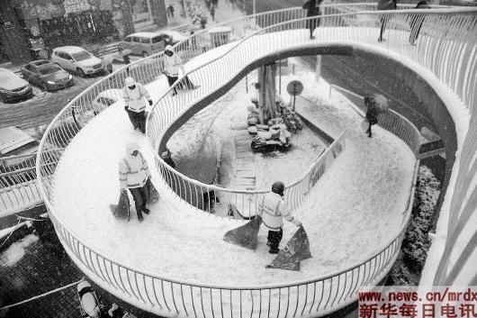 ▲1月3日,在湖北省襄阳市,市政管理处工人在铺设防滑垫。当日,受冷空气影响,我国多地迎来降雪。