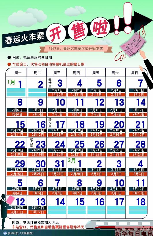 2018年春运自2月1日开始,3月12日结束,共40天。网络、电话订票预售期为30天,车站窗口、代售点和自动售票机预售期为28天。