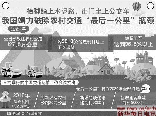 道路改变命运,未来从脚下开始。日前举行的全国交通运输工作会议提出:“最后一公里”将在2020年全部打通。其中,2018年将新改建农村公路20万公里,新增通硬化路建制村5000个,新增通客车建制村5000个。尤其以西藏、四省藏区、新疆南疆四地州和四川凉山州、云南怒江州、甘肃临夏州等“三区三州”等深度贫困地区为重点。