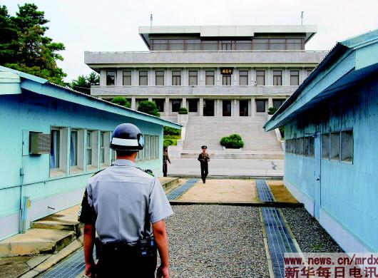 2007年10月4日拍摄的资料照片显示,在朝鲜半岛中部的板门店,一名韩国宪兵(左)和一名朝鲜人民军士兵分别在军事分界线两侧执勤。