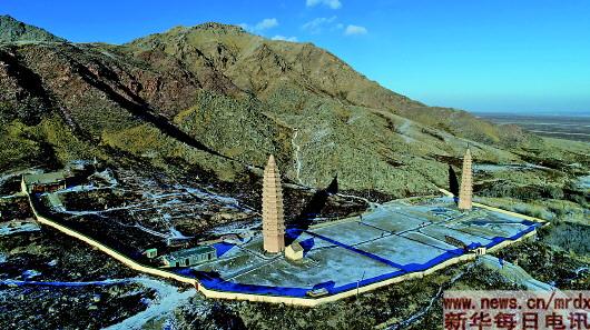 1月8日拍摄的贺兰山拜寺口双塔。近日,在连续多日的降雪过后,宁夏银川市迎来晴好天气,再现“贺兰晴雪”美景。