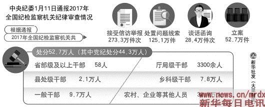 新华社北京1月11日电(记者朱基钗)中央纪委11日通报2017年全国纪检监察机关纪律审查情况。2017年全国纪检监察机关共处分52.7万人,其中包括省部级及以上干部58人。 根据通报,2017年全国纪检监察机关共接受信访举报273.3万件次,处置问题线索125.1万件,谈话函询28.4万件次,立案52.7万件,处分52.7万人(其中党纪处分44.3万人)。处分省部级及以上干部58人,厅局级干部3300余人,县处级干部2.1万人,乡科级干部7.8万人,一般干部9.7万人,农村、企业等其他人员32.7万人。