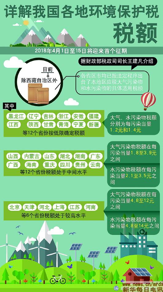 新华社北京1月11日电(记者郁琼源)2018年1月1日起,我国首个以环境保护为目标的绿色税种——环境保护税正式施行,以此取代了施行近40年的排污收费制度。环保税按季申报缴纳,2018年4月1日至15日将迎来首个征期。 环保税如何征收?税率如何确定?对哪些行业影响较大?针对各界关心的问题,财政部、税务总局、环保部有关负责人接受了记者采访。