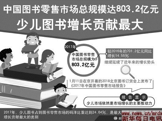 童书馆是本届图书订货会最具人气的场馆之一。根据在本届北京图书订货会上发布的《2017年中国图书零售市场报告》,2017年,全国图书零售市场动销品种数189.36万,比2016年增长了8.19%。其中,少儿市场依然是市场增长的主要推动力。2017年,少儿图书占到图书零售市场的码洋比重达到24.64%,是最大的细分类,也成为市场增长贡献最大的类别。