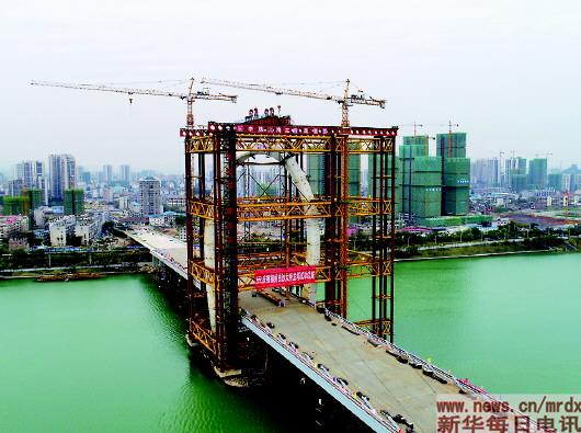 1月12日,世界上最高、跨度最大的“反对称结构斜拉桥”——广西柳州白沙大桥主塔成功合龙,大桥建设进入最后阶段。新华社发(李斌摄)