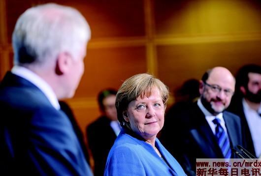 | ▲1月12日,在德国首都柏林的社民党总部,德国总理、基民盟主席默克尔(中)、基社盟主席泽霍费尔(左)和社民党主席舒尔茨出席试探性组阁谈判结束后的新闻发布会。新华社记者单宇琦摄