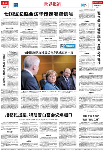 2017年9月,德国举行联邦议院选举,联盟党和社民党得票率虽双双大幅下跌,但分别维持了议会第一和第二大党地位。2018年1月7日,社民党根据党代会决定,同联盟党展开试探性对话,内容涉及财政、能源、移民政策等15个主题。该党是否正式同联盟党组成联合政府,还要等拟于21日召开的新一轮党代会作出决定。