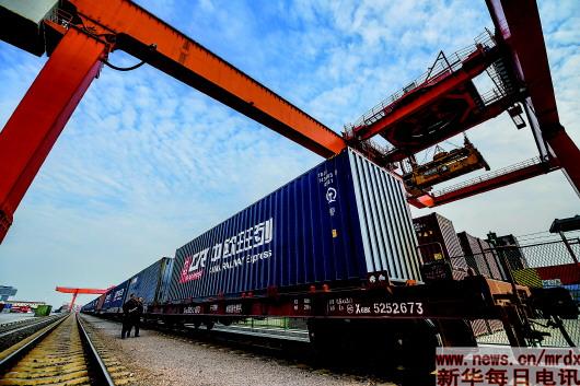 ▲2017年11月8日,在浙江义乌西站,满载货物的中欧班列即将启程。