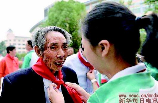 ▲2017年10月19日,义乌学校的学生替谢书记戴红领巾。