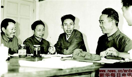 ▲谢高华(右二)担任义乌县委书记时的资料照片(1982年摄)。