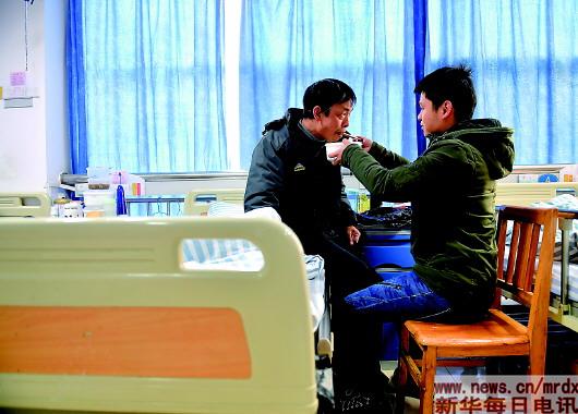 一位患者家属将自己烧好的饭菜喂给自己父亲(1月8日摄)。