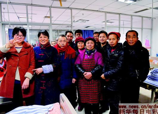 熊庚香(右五)在病房内和家属以及患者合影,他们平日里都是熊庚香的朋友(1月8日摄)。