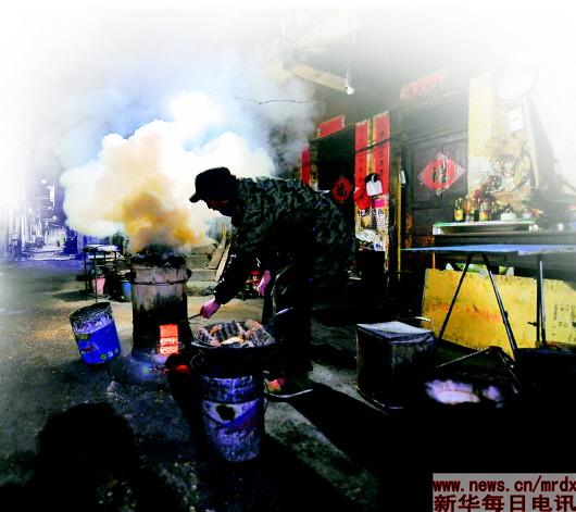 清晨4时左右,万佐成正在为前来烧饭的客人准备炭炉(1月11日摄)。