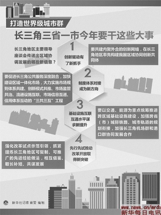 ——基础设施互联互通水平谋求新提升。会议提出,要以交通、能源为重点统筹推进跨区域基础设施建设,加强跨省(市)城际铁路、城市轨道的规划衔接,加强长三角机场群和港口群协同发展合作。