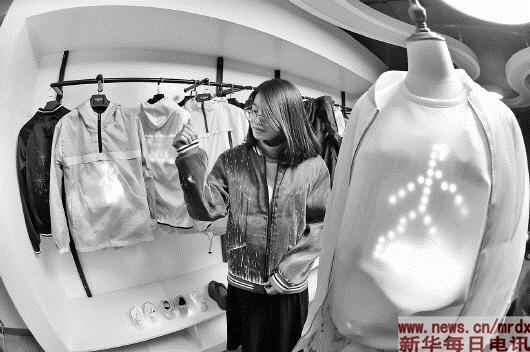 ▲1月11日,在福建省石狮市一家智能服装生产企业,工作人员在展示采用可水洗柔性LED技术的智能服装。该技术由这家企业自主研发。