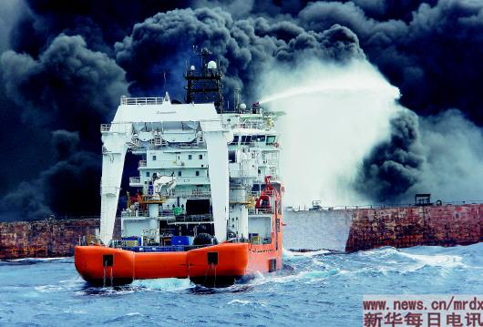 虽然风浪变小,登上烈火中的“桑吉”轮仍然危险重重。由于载有十几万吨凝析油和航行使用的重型柴油,“桑吉”轮随时有可能发生燃爆,作业船几次因为燃爆被迫后退。