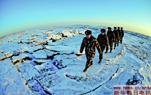 1月16日,兴城中兴边防派出所官兵在海边查看冰情。近日,辽宁省兴城市中兴海滩附近的海面上出现大片海冰,呈现壮美的景观。
