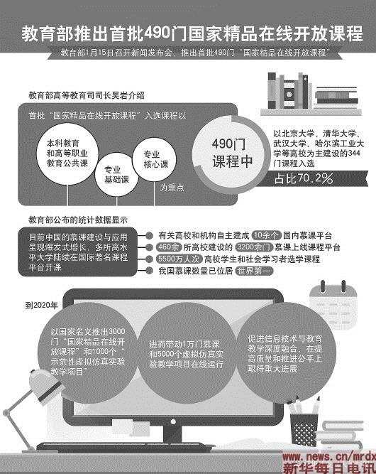 新华社北京1月15日电(记者胡浩)教育部15日召开新闻发布会,推出首批490门“国家精品在线开放课程”。 作为互联网和高等教育结合的产物,大规模在线开放课程(慕课)近年来迅速在世界范围兴起,这种新型课程及教学模式打破了教育的时空界限、学校的围墙,颠覆传统大学课堂教与学的方式。