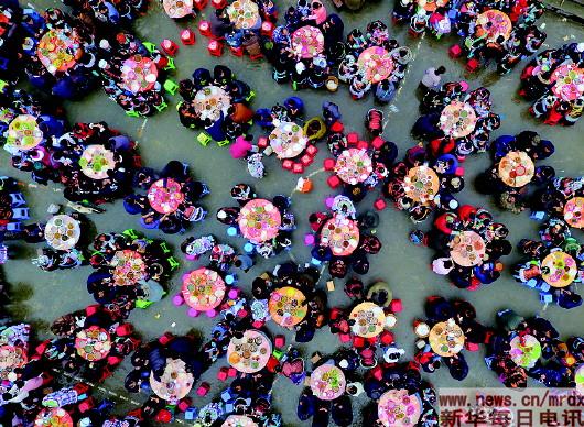 1月17日,广西融水苗族自治县杆洞乡党鸠村群众欢聚一堂,吹芦笙、唱苗歌、跳苗舞、品百家宴,欢度苗年。