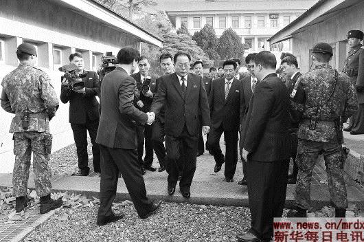 ▲1月17日,朝方代表团团长、朝鲜祖国和平统一委员会副委员长田钟秀(中)跨过军事分界线前往板门店韩方一侧的“和平之家”。朝韩双方代表17日在板门店韩方一侧的“和平之家”举行有关朝方派团参加平昌冬奥会事宜的次官级(副部长级)实务会谈,并就多项事宜达成一致。