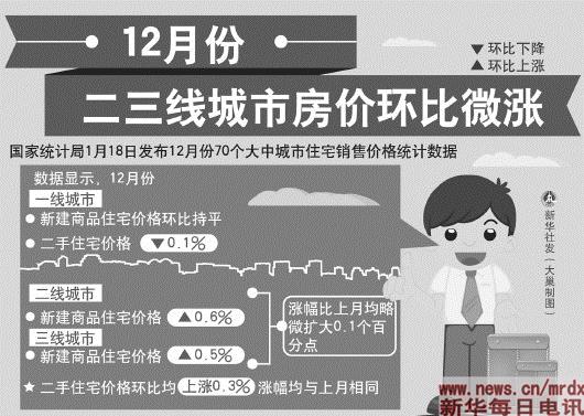 二三线城市房价环比微涨 据国家统计局初步测算,12月份,一线城市新建商品住宅价格环比持平,二手住宅价格环比下降0.1%。二、三线城市新建商品住宅价格环比分别上涨0.6%和0.5%,涨幅比上月均略微扩大0.1个百分点;二手住宅价格环比均上涨0.3%,涨幅均与上月相同。