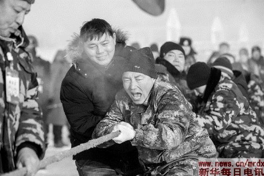 ▲1月19日,布尔津县冲乎尔镇牧民在进行拔河比赛。