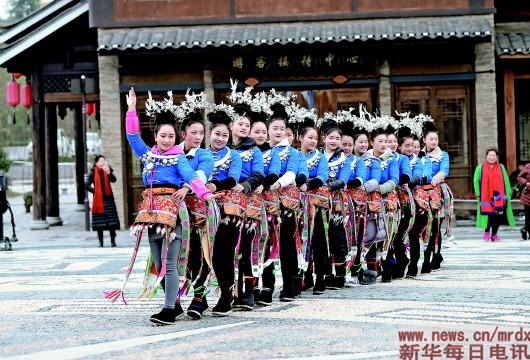 1月20日,在贵州省黔东南苗族侗族自治州丹寨县万达小镇,苗族姑娘们跳起锦鸡舞。
