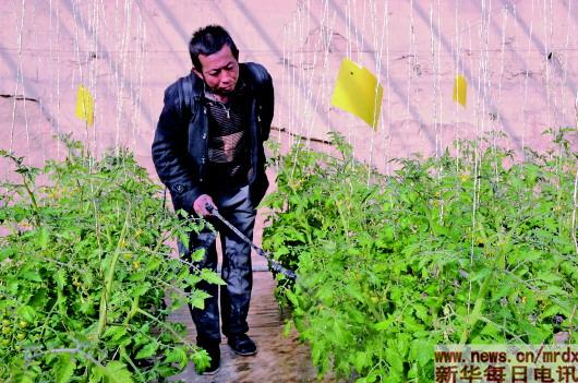 1月19日,甘肃省永靖县三塬镇下塬村村民喷洒生物农药,照料日光温室里的农作物。新华社发(王铭禹摄)