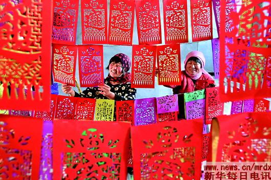 1月23日,山东省沂源县中庄镇中韩庄村的妇女在摆放“过门签”。“过门签”在当地又俗称“过门钱”或“挂钱”,人们过年粘贴在门楣上,有迎财纳福的吉祥寓意。