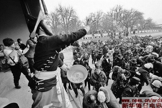 ▲1月24日,在宁夏固原市隆德县腊八节民俗活动上,演员向群众抛撒象征幸运的五谷杂粮。