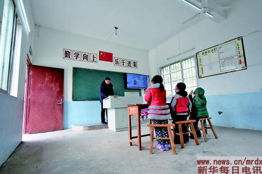 在重庆市荣昌区铜鼓镇高山村小学,下课铃声响起,学生们与谭泽光告别(1月18日摄)。新华社记者唐奕摄