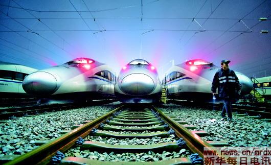 当日凌晨,近百组动车组停靠在武汉动车段的存车线上,蓄势待发,势如“陆地舰队”。工作人员冒着低温,在风雪中对列车进行保温、检修等作业。春运将至,武汉动车段的工作人员精检细修,全力提高动车组的检修质量,确保春运期间高铁动车运行安全顺畅。新华社记者肖艺九摄