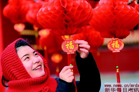 ▲1月27日,一名女孩在北京地坛公园南门外观赏灯笼。狗年春节临近,为迎接第33届北京地坛春节文化庙会,北京地坛公园内外装扮一新。新华社发(陈晓根摄)