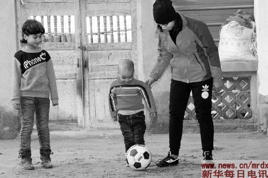 ▲凯丽比努尔(右)在自家小院教弟弟妹妹踢足球。 新华社记者孙哲摄