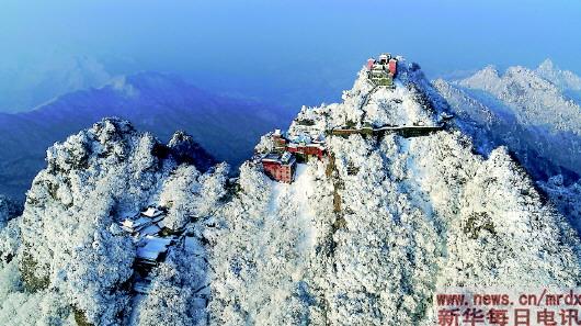 这是1月29日航拍的湖北武当山金顶景区雪景。连日降雪让武当山金顶景区的建筑在白雪装扮下宛如琼楼玉宇。