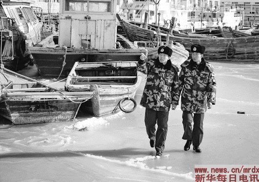 近日,受寒潮影响,河北省秦皇岛近海区域出现持续冰情,秦皇岛边防支队官兵针对渔港、码头等重点区域加强巡防,排查安全隐患,向渔船民宣传安全防范知识,确保辖区群众安全过冬。