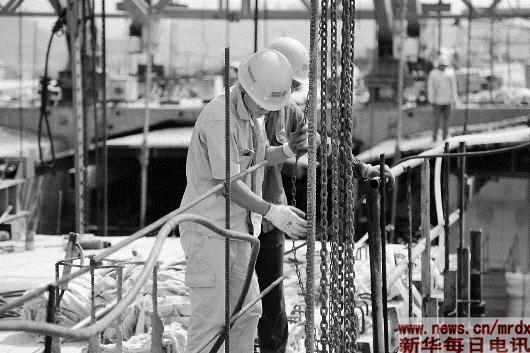 ▲工人们正在福建漳浦县沿海大通道旧镇湾特大桥施工。旧镇湾特大桥是省级重点项目漳州沿海大通道的重要组成部分和控制性工程,全长1818米,按双向六车道一级公路标准设计。