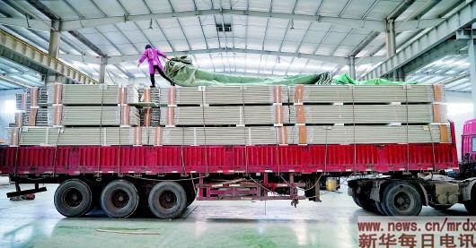 ▲1月16日,在浙江省杭州市的一家工厂,王艳青为货物盖雨布。