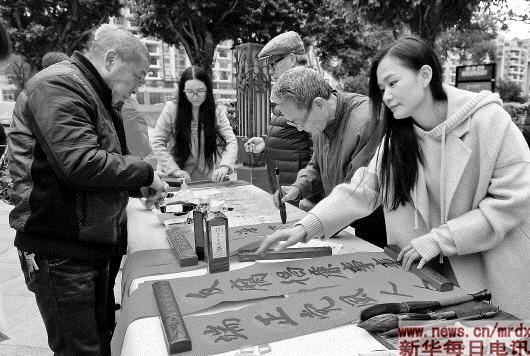 近日,福建省福州市晋安区王庄街道举行以“移风易俗你我他 惠民资金进万家”为主题的“百姓讲堂”活动,书法爱好者在活动现场为社区居民书写反腐倡廉的春联。2016年6月以来,该街道开设“百姓讲堂”,以群众喜闻乐见的闽剧、相声等方式,宣传党规党纪和方针政策,展现崇廉向善、文明节俭的新风尚。