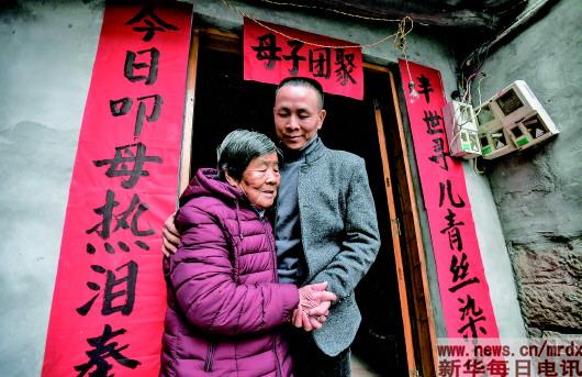 ▲1月21日,在四川泸县方洞镇,艾秀平在家门口与儿子杨荣拥抱。新华社记者薛玉斌摄