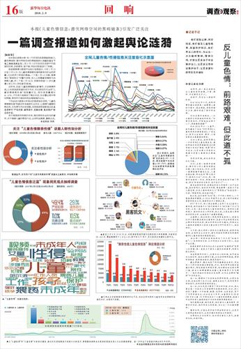 由本报记者袁汝婷、毛一竹采写的深度调查报道《儿童色情信息:潜伏网络空间的黑暗链条》(扫描本版右下角二维码阅读全文),自2月2日刊发后在读者中引起强烈反响,多家媒体、客户端、网站对报道进行了转载。