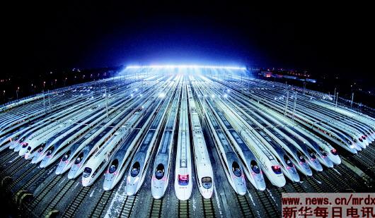 ▲2018年2月1日凌晨,动车组停靠在武汉动车段的存车线上,准备进行检修和保温作业。新华社记者肖艺九摄