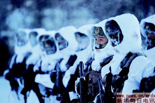 ▲驻守在漠河县北极村的北部战区陆军某部官兵巡逻间隙展开训练(2月5日摄)。新华社记者李刚摄
