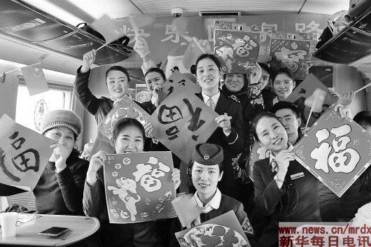2月8日,北京南至合肥G131次列车上,全体乘务员自编自演,为旅客奉送了一台精彩的列车春晚。图为列车工作人员为旅客送“福”。