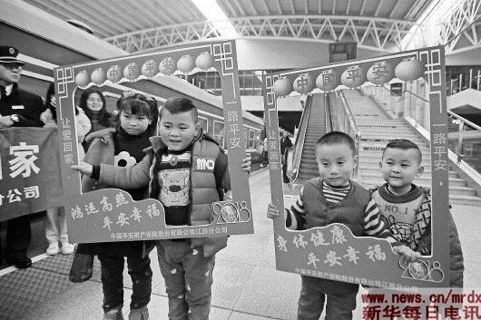 小朋友们在返乡专列开行前合影(2月10日摄)。2月10日,中国铁路南昌局集团有限公司向塘机务段开行汕头到南昌3184次返乡专列,接送2800名农民工兄弟和家属回家过年。