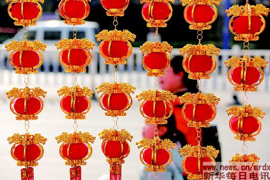 2月13日,市民在山东省枣庄市年货一条街选购新年饰品。春节将至,各地红红火火,一派喜气景象。